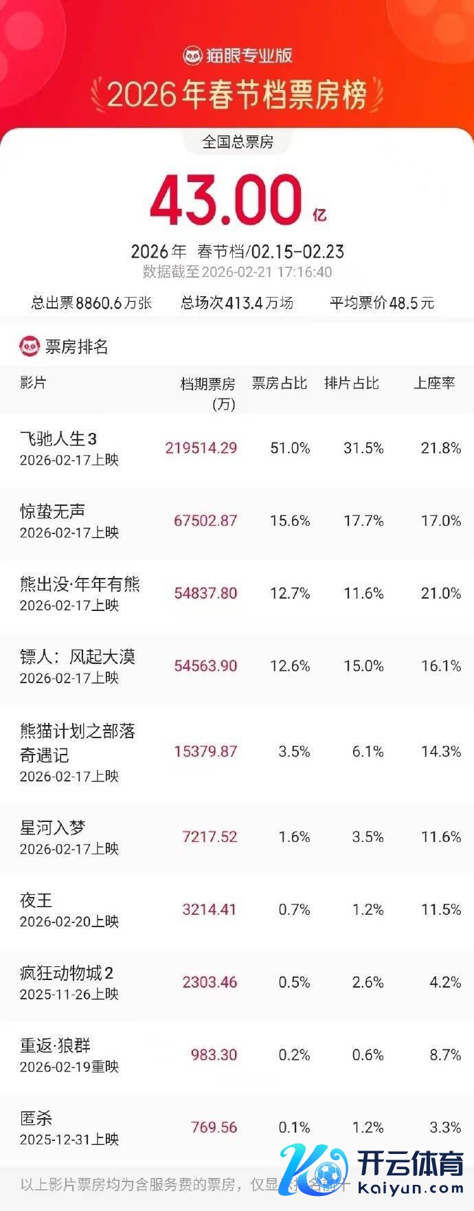 据猫眼专科版,落幕2月21日17时16分,2026春节档(2月15日~2月23日)档期总票房(含预售)扯后腿43亿元。