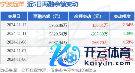 本站音书,11月12日开云(中国)kaiyun网页版登录入口,宁波远洋(601022)融资买入935.31万元,融资偿还798.91万元,融资净买入136.4万元,融资余额5949.17万元,近20个交游日中有11个交游日出现融资净买入。