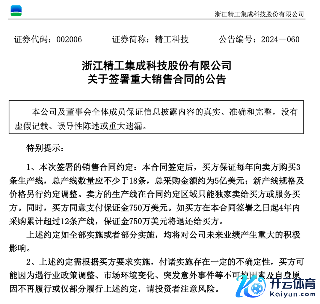精工科技称,本次往来主如若公司为进一步加速新材料装备的商场征战力度,属于深广的销售行动,本次合同分期实施,建树总金额为1.64亿好意思元,约占公司2023年度经审计贸易总收入的76.76%,后续若合同顺利履行,将扩大公司新材料装备的产销限度,对公司将来盘算推算功绩产生关键的积极影响。