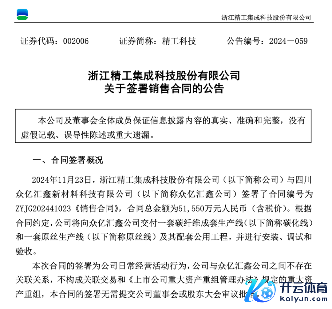 精工科技示意,本次往来主如若公司为进一步加速系列碳纤维装备的商场征战力度,属于深广的销售行动。合同总金额占公司2023年度经审计贸易总收入的29.62%。后续若合同顺利履行,将扩大公司系列碳纤维装备的产销限度,对公司将来盘算推算功绩产生积极影响。